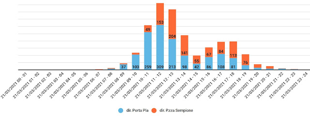 Guardando i dati di ieri (21.3.2021) ovviamente la curva è strepitosa, ma si vedeva chiaramente guardandosi intorno quanta gente in bici in tutta la città. Domenica, la bella giornata, la riduzione drastica del traffico automobilistico (c'è da riflettere) ed i limiti imposti dalla zona rossa hanno portato sempre più persone a prendere la bici.