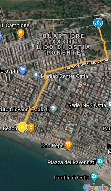 Scendiamo a Lido Nord e vorremmo arrivare sul lungomare per poi raggiungere Fiumicino, orientandomi a naso presi via delle Molucche in direzione nord, incrociammo un tracciato ciclabile sul marciapiedi e lo seguimmo fino al lungomare dove poi trovammo un altro percorso ciclabile e via fino al Porto, poi via Chiaraluce e Fiumicino.