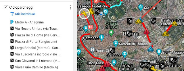 La mappatura richiederebbe più icone, ma la scelta da sempre è quella di cercare di dare informazioni senza eccedere "in finezze". Qui la mappa comprensiva dei cicloparcheggi (
