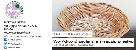 Siamo lieti di invitarvi sabato 25 ottobre al corso di cesteria e di intreccio creativo all’Hortus Urbis. Imparare a intrecciare i vimini e realizzare un cesto con le proprie mani in una sola giornata ti pare impossibile? Non lo è! Ogni partecipante porterà a casa il proprio cestino realizzato con le proprie mani. Hortus Urbis, [...]