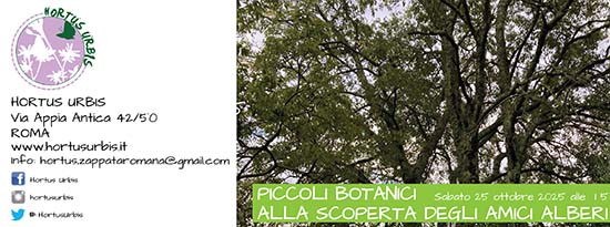 Siamo lieti di invitarvi sabato 25 ottobre ad un evento autunnale all’aria aperta all’Hortus Urbis, l’orto antico romano nel Parco dell’Appia Antica. Alle ore 15.00 – PICCOLI BOTANICI: ALLA SCOPERTA DEGLI AMICI ALBERI | a cura di Francesca Carocci Unisciti a noi per una passeggiata nel parco più bello di Roma! Scopriremo il nome e [...]