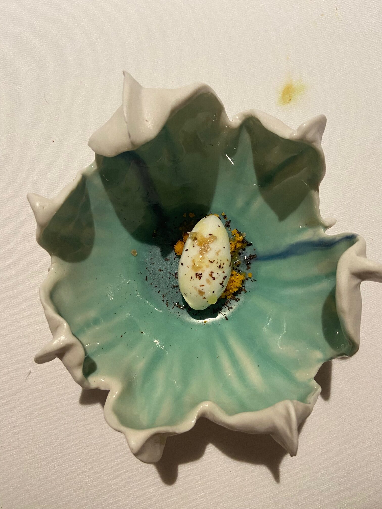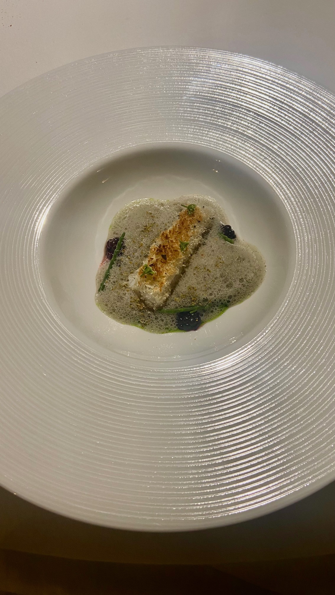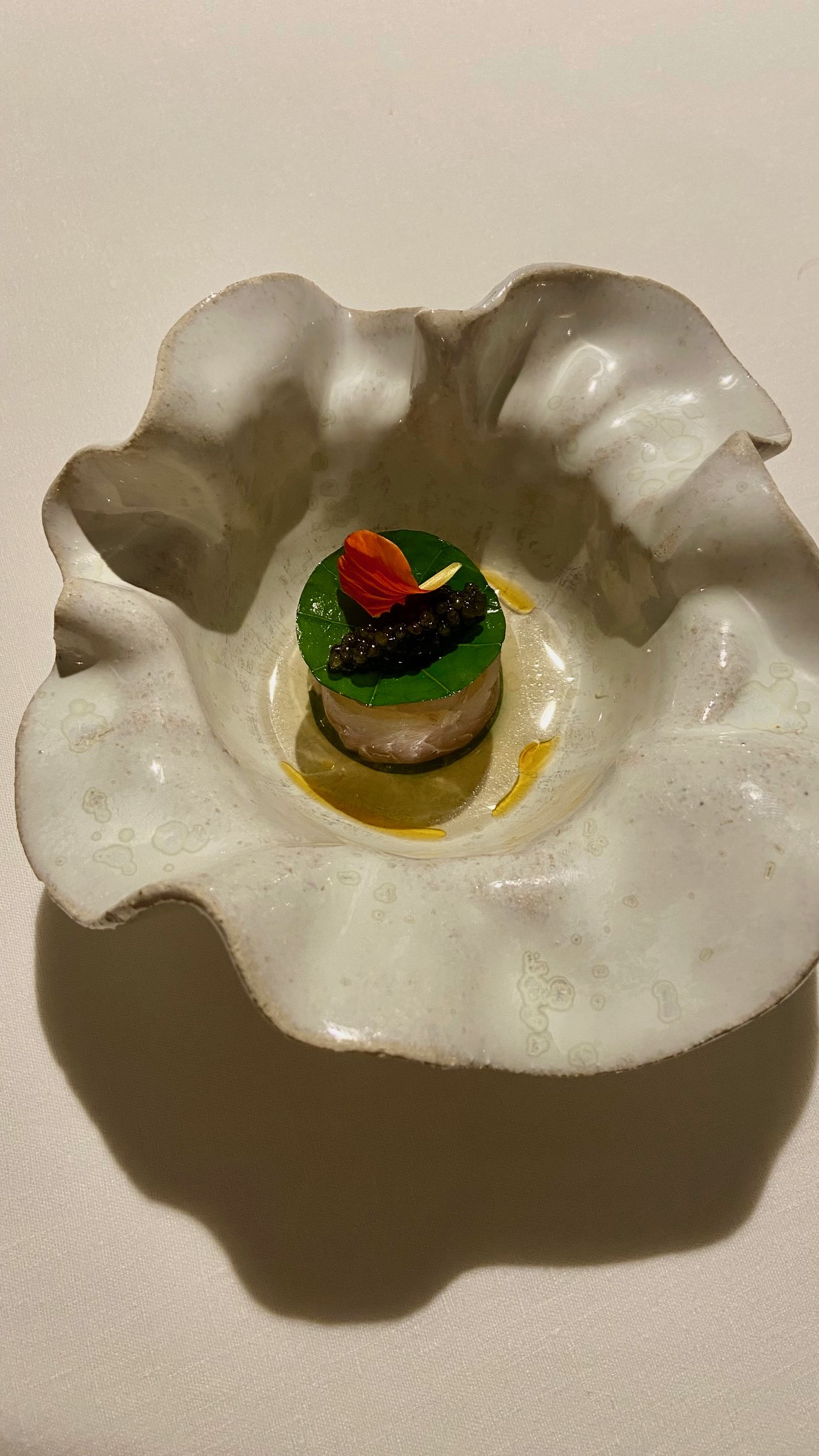 La seconda portata, da noi volutamente estratta in aggiunta dal menù dei classici è “Nasturzio, Caviale, Tuorlo e Capperi 2018”, che ci invitano a mangiare in un boccone unico. Un viaggio breve ma intenso, dove sorprende l’abilità nell’utilizzo delle foglie che degnamente si associano ai tanti ingredienti percepibili nel singolo assaggio.