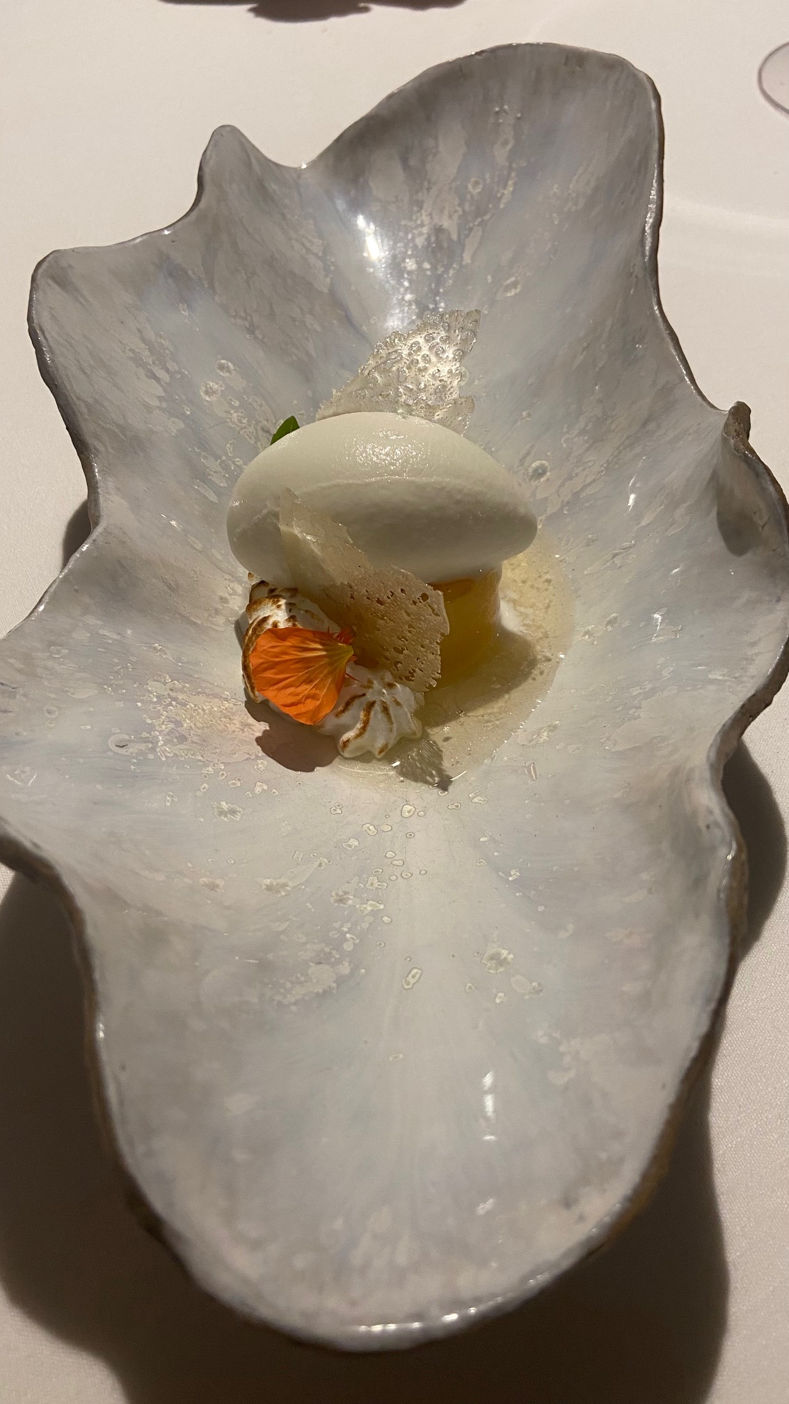 Optiamo poi per un altro fuori percorso: al tavolo giunge l’iconico risotto agli scampi affumicati e vaniglia del 2007. Un piatto che necessita di ben poche presentazioni, evolutosi nel tempo ma dalle caratteristiche comfort al quale lo Chef non vuole rinunciare. Anche in questo caso abbiamo avvertito vagamente qualche prominente picco sapido.