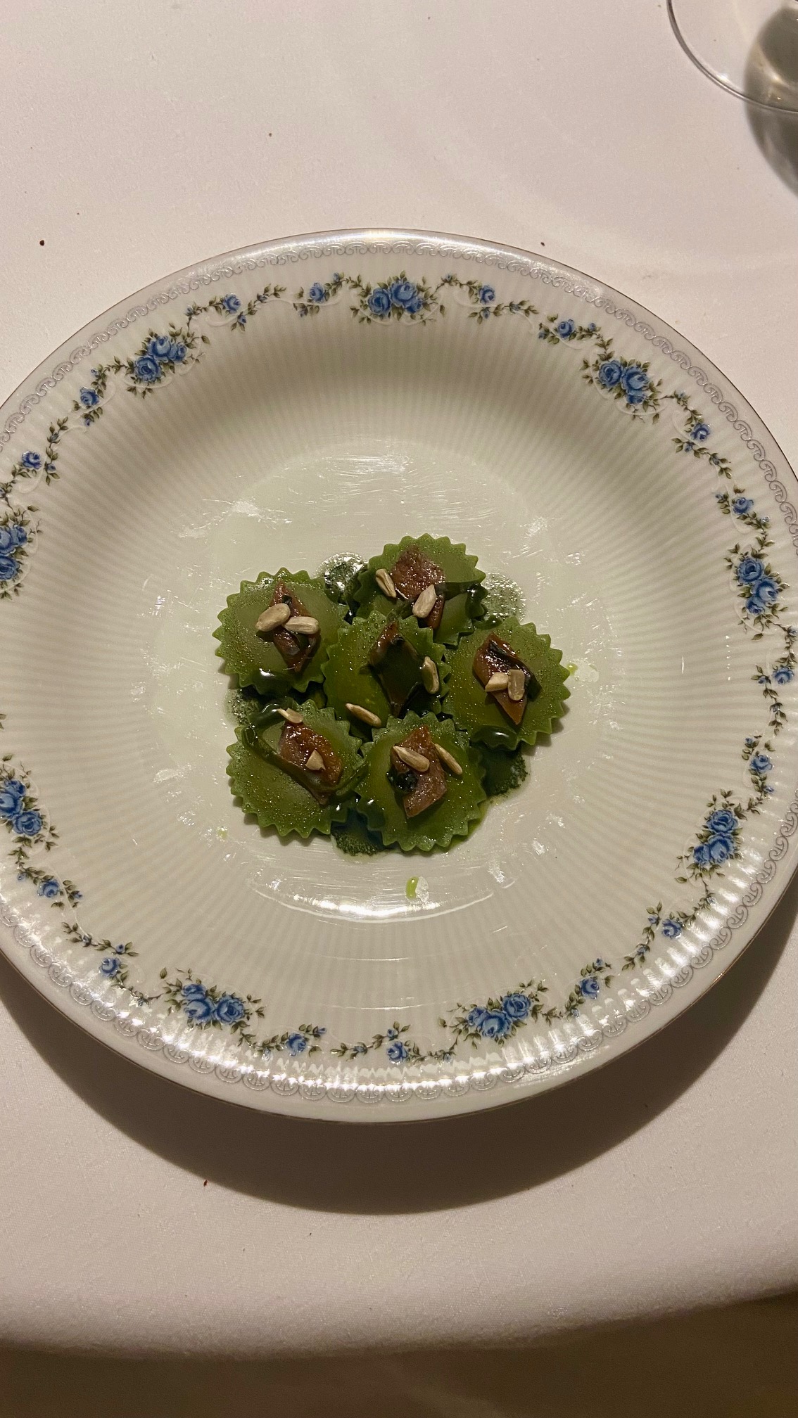 I bottoncini alla zucca, alici e burro fermentato alle alghe sono quelli che ci hanno stupito di più per la gestione dei sapori (buonissime le alici di Cetara). Sorprende la scioglievole consistenza dell’ortaggio, che perfettamente aderisce alla pasta verde (sempre tirata maniacalmente dalla cucina).