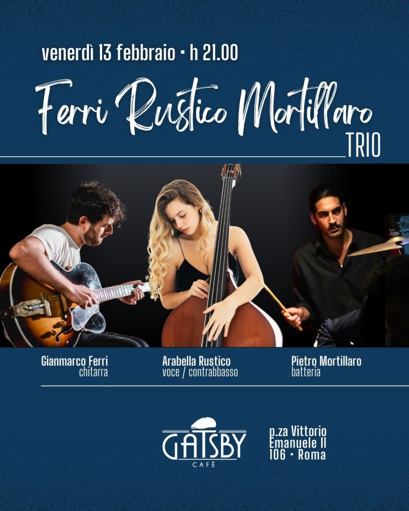 13 febbraio 2026 ore 21:00 GATSBY CAFE’ Ferri Rustico Mortillaro Jazz Trio Line-up: Arabella Rustico • voce e contrabbassoGianmarco Ferri • chitarraPietro Mortillaro • batteria