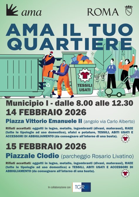 Sabato 14 febbraio 2026 dalle 8,00 alle 12,30 ritorna la raccolta dei rifiuti ingombranti nel I Municipio a Piazza Vittorio lato via Carlo Alberto