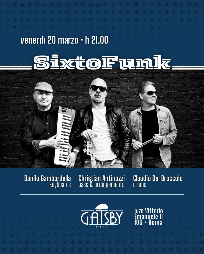 20 marzo 2026 ore 21:00 GATSBY CAFE’ SixtoFunk Line-up! Danilo Gambardella • keyboardsChristian Antinozzi • bass & arrangementsClaudio Del Broccolo • drums