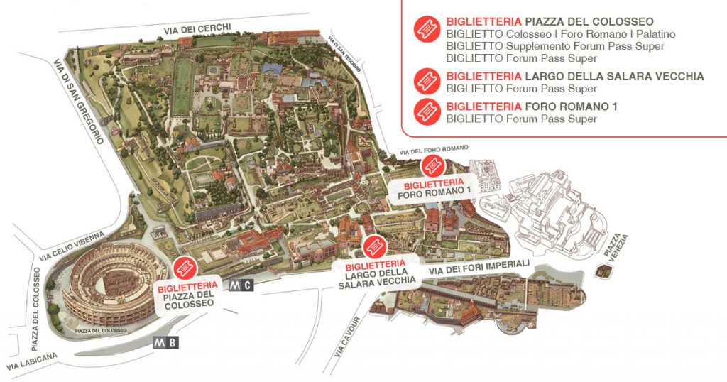 A partire dal giorno 4 maggio 2026 i biglietti della tipologia 24h Colosseo, Foro Romano, Palatino saranno disponibili esclusivamente presso la biglietteria di piazza del Colosseo, dove sarà rinforzato il servizio. Presso le biglietterie di Largo della Salara Vecchia e Foro Romano 1 saranno disponibili esclusivamente biglietti Forum Pass SUPER.
