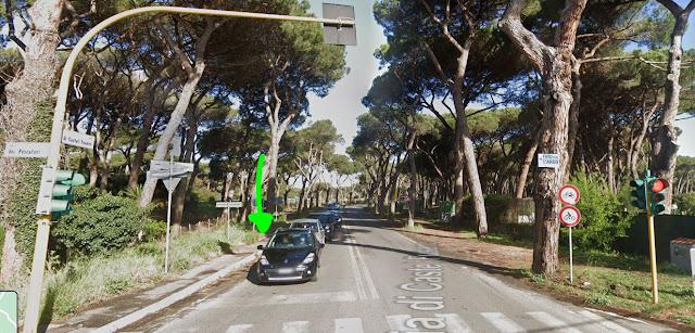 Ad esempio sulla (OSTIA_07) via di Castel Fusano c'è divieto d'accesso stradale per le bici (e le due ruote a motore) per chi proviene da via dei Pescatori, e l'accesso alla ciclabile a doppio senso di marcia è molto all'interno sul marciapiedi stretto, più o meno dove ho disegnato la freccia verde.